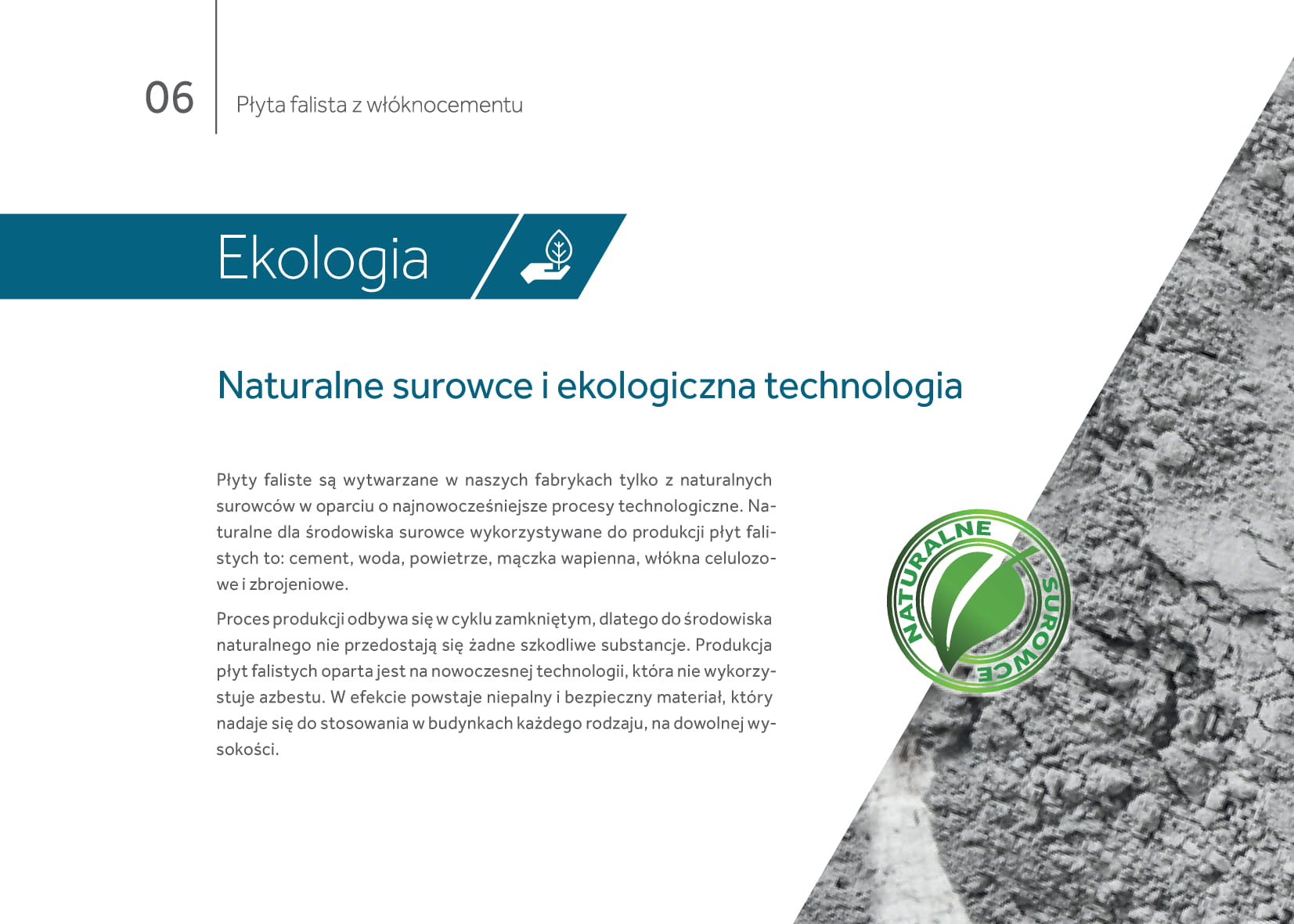 Znajoma forma wpisana w polski krajobraz podana w nowoczesnej, ekologicznej odsłonie powoduje, że płyta idealnie nadaje się do renowacji i wymiany starych azbestowych dachów. W odróżnieniu od starych płyt falistych nie zawiera szkodliwego azbestu, wykonana jest wyłącznie z ekologicznych surowców.