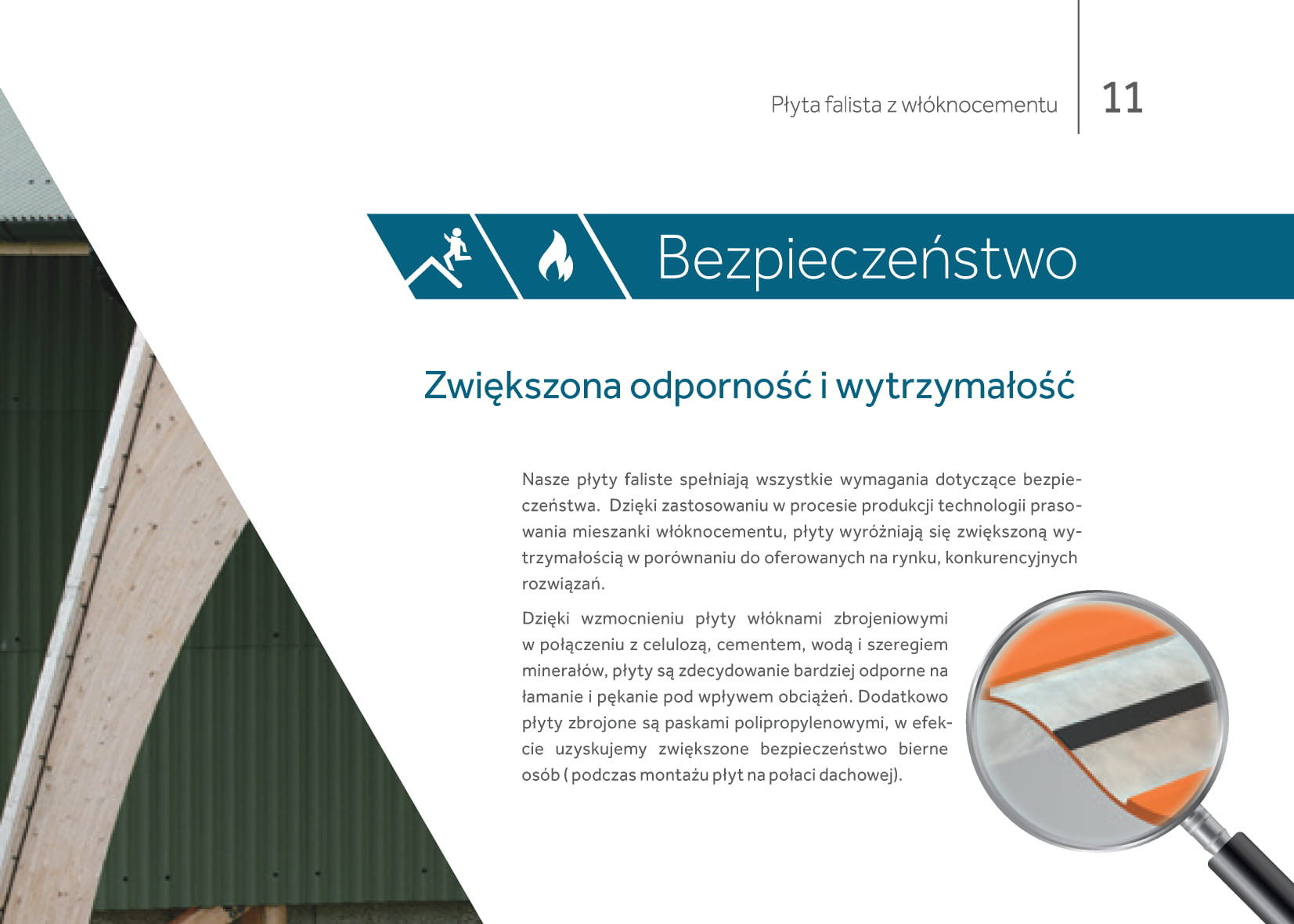Dzięki wzmocnieniu płyty włóknami zbrojeniowymi w połączeniu z celulozą, cementem, wodą i szeregiem minerałów, płyty są zdecydowanie bardziej odporne na łamanie i pękanie pod wpływem obciążeń. Dodatkowo płyty zbrojone są paskami polipropylenowymi, w efekcie uzyskujemy zwiększone bezpieczeństwo bierne osób ( podczas montażu płyt na połaci dachowej).