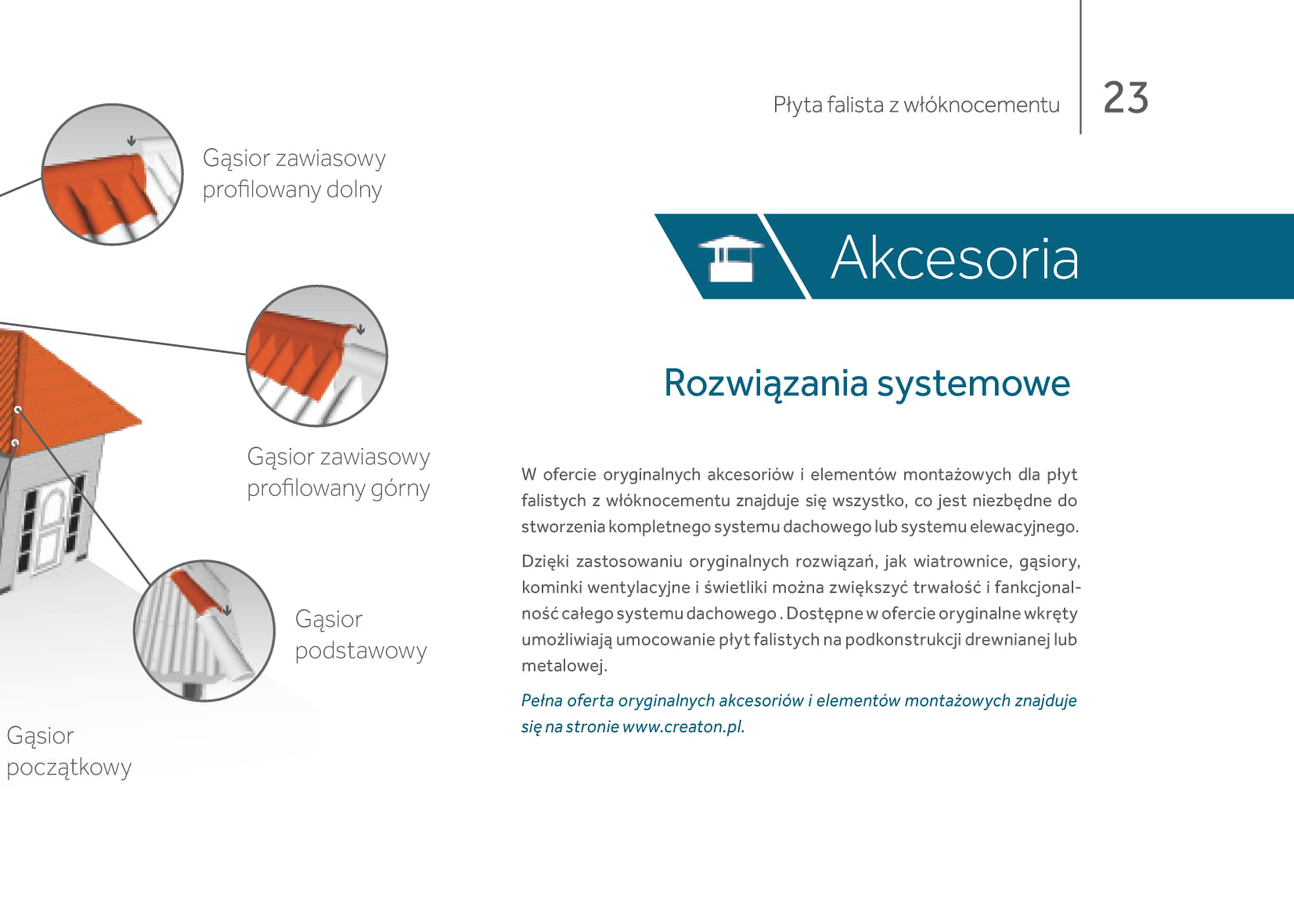 W ofercie oryginalnych akcesoriów i elementów montażowych dla płyt falistych z włóknocementu znajduje się wszystko, co jest niezbędne do stworzenia kompletnego systemu dachowego lub systemu elewacyjnego. Dzięki zastosowaniu oryginalnych rozwiązań, jak wiatrownice, gąsiory, kominki wentylacyjne i świetliki można zwiększyć trwałość i fankcjonal – ność całego systemu dachowego . Dostępne w ofercie oryginalne wkręty umożliwiają umocowanie płyt falistych na pod konstrukcji drewnianej lub metalowej.