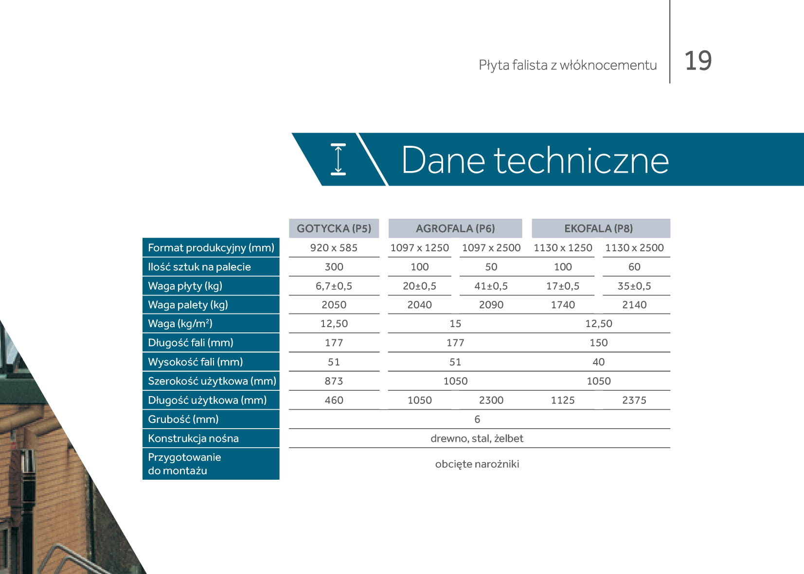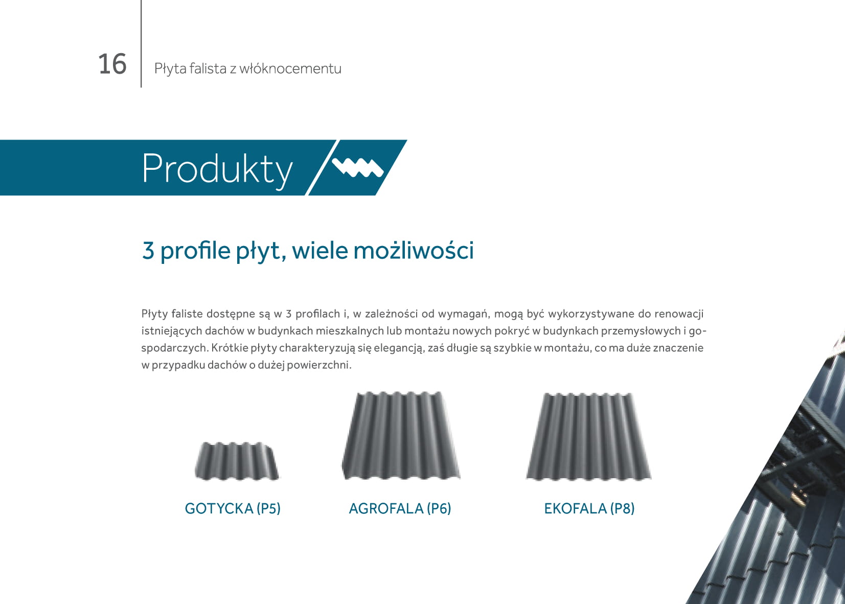 Płyty faliste dostępne są w 3 profilach i w zależności od wymagań, mogą być wykorzystywane do budowy nowych, jak i renowacji istniejących dachów w budynkach gospodarczych. Duży format płyt zapewnia szybki montaż, co ma duże znaczenie w przypadku dachów o dużej powierzchni.