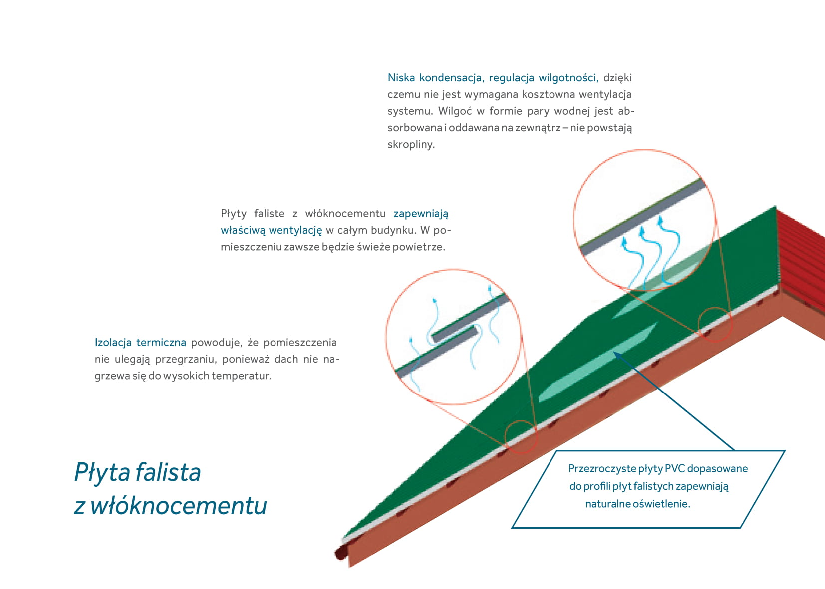 Unikalna forma płyt falistych wpływa znacząco na zwiększenie skutecznej wentylacji pomieszczeń. Niepowtarzalny na rynku profil sprzyja niskiej kondensacji, regulacji wilgotności – samoczynnej dyfuzji wilgoci, dzięki czemu nie jest wymagana kosztowna wentylacja systemu. Wilgoć w formie pary wodnej jest absorbowana, dzięki czemu pod powierzchnią dachu nie powstają skropliny.